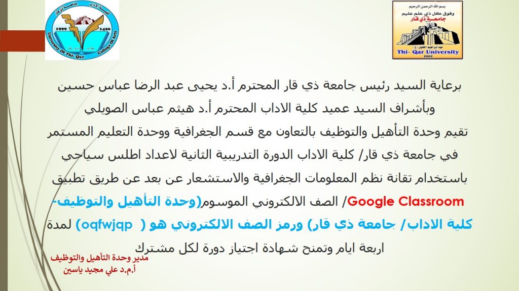 برعاية السيد رئيس جامعة ذي قار المحترم أ.د يحيى عبد الرضا عباس حسين وبأشراف السيد عميد كلية الآداب المحترم أ.د هيثم عباس الصويلي تقيم وحدة التأهيل والتنظيف بالتعاون مع قسم الجغرافية ووحدة التعليم المستمر في جامعة ذي قار/ كلية الآداب الدورة التدريبية الأولى لإعداد اطلس سياحي باستخدام تقانة نظم المعلومات الجغرافية والاستشعار عن بعد عن طريق … تابع قراءة الدورة التدريبية الأولى لوحدة التاهيل والتوظيف الموسومة ( إعداد اطلس سياحي باستخدام تقانة نظم المعلومات الجغرافية والاستشعار عن بعد )