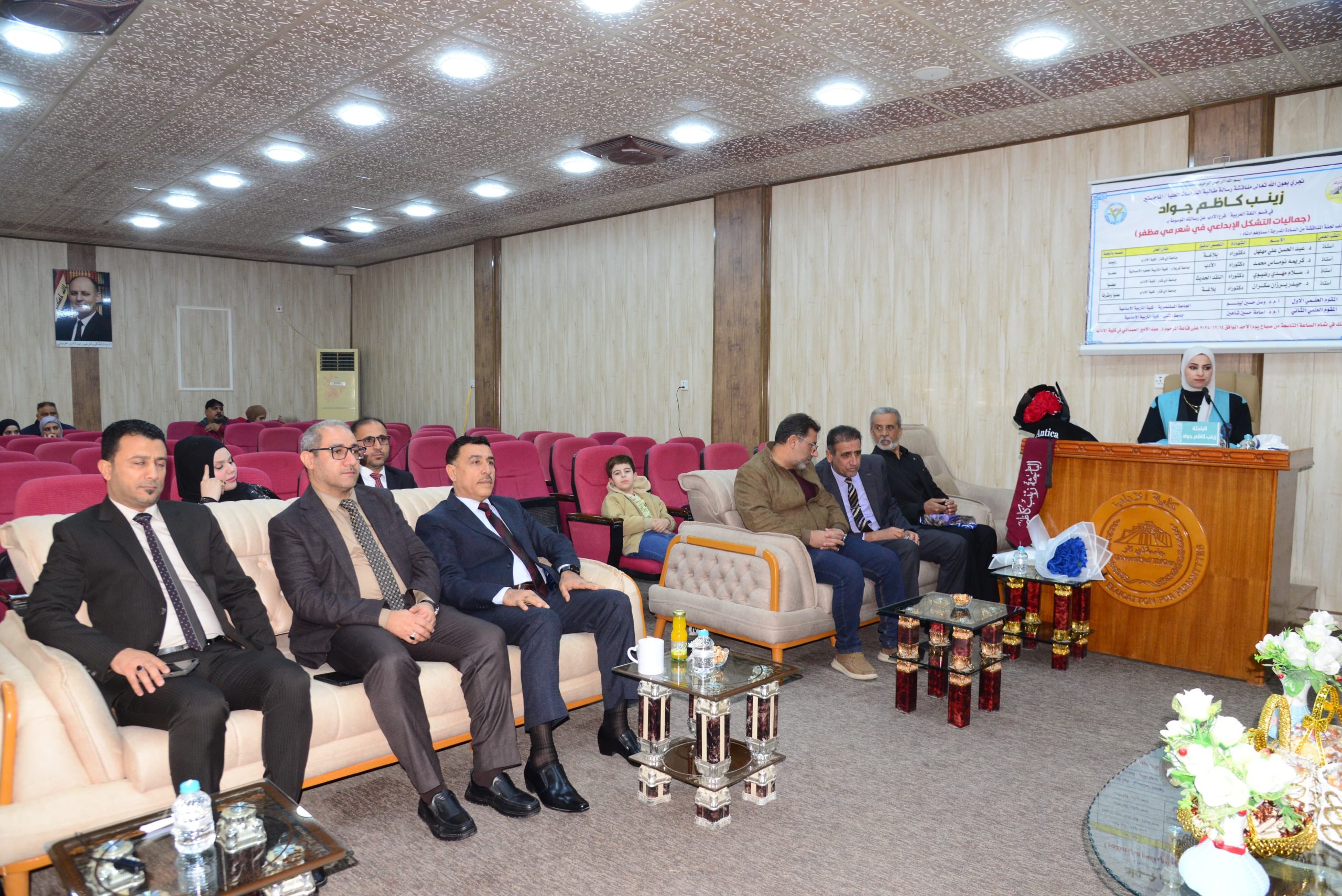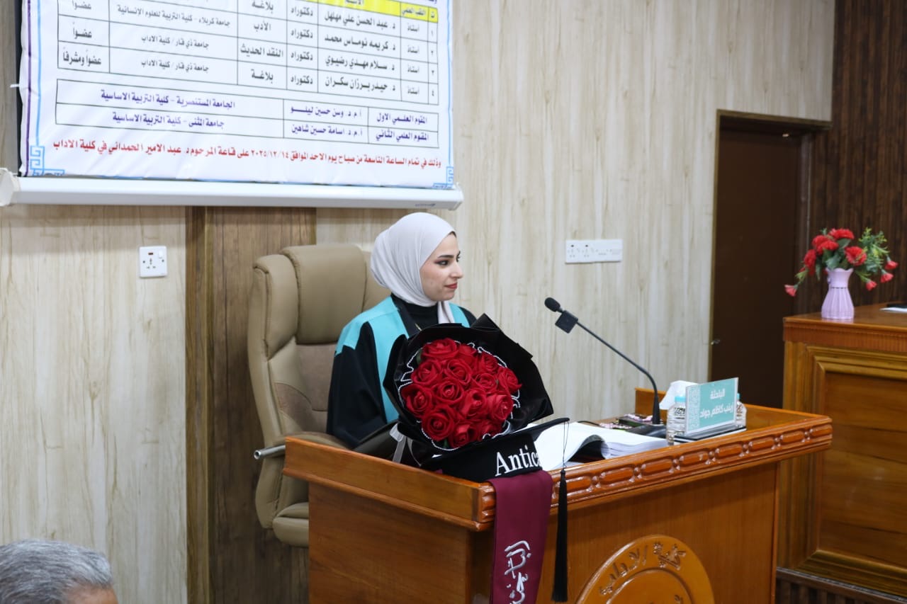 جرت، بعون الله تعالى، في قاعة الأستاذ الدكتور عبد الأمير الحمداني، يوم الأحد الموافق 14/12/2025، مناقشة رسالة طالبة الماجستير في قسم اللغة العربية / فرع الأدب، زينب كاظم جواد، الموسومة بـ «جماليات التشكل الإبداعي في شعر مي مظفّر».