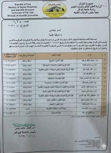 تتقدم عمادة كلية الآداب في جامعة ذي قار بأسمى آيات التهاني والتبريكات إلى أساتذتها الأفاضل الذين صدرت بحقهم أوامر الترقية العلمية مؤخرًا، وذلك استنادًا إلى توصية لجنة الترقيات المركزية ومصادقة السيد رئيس الجامعة.